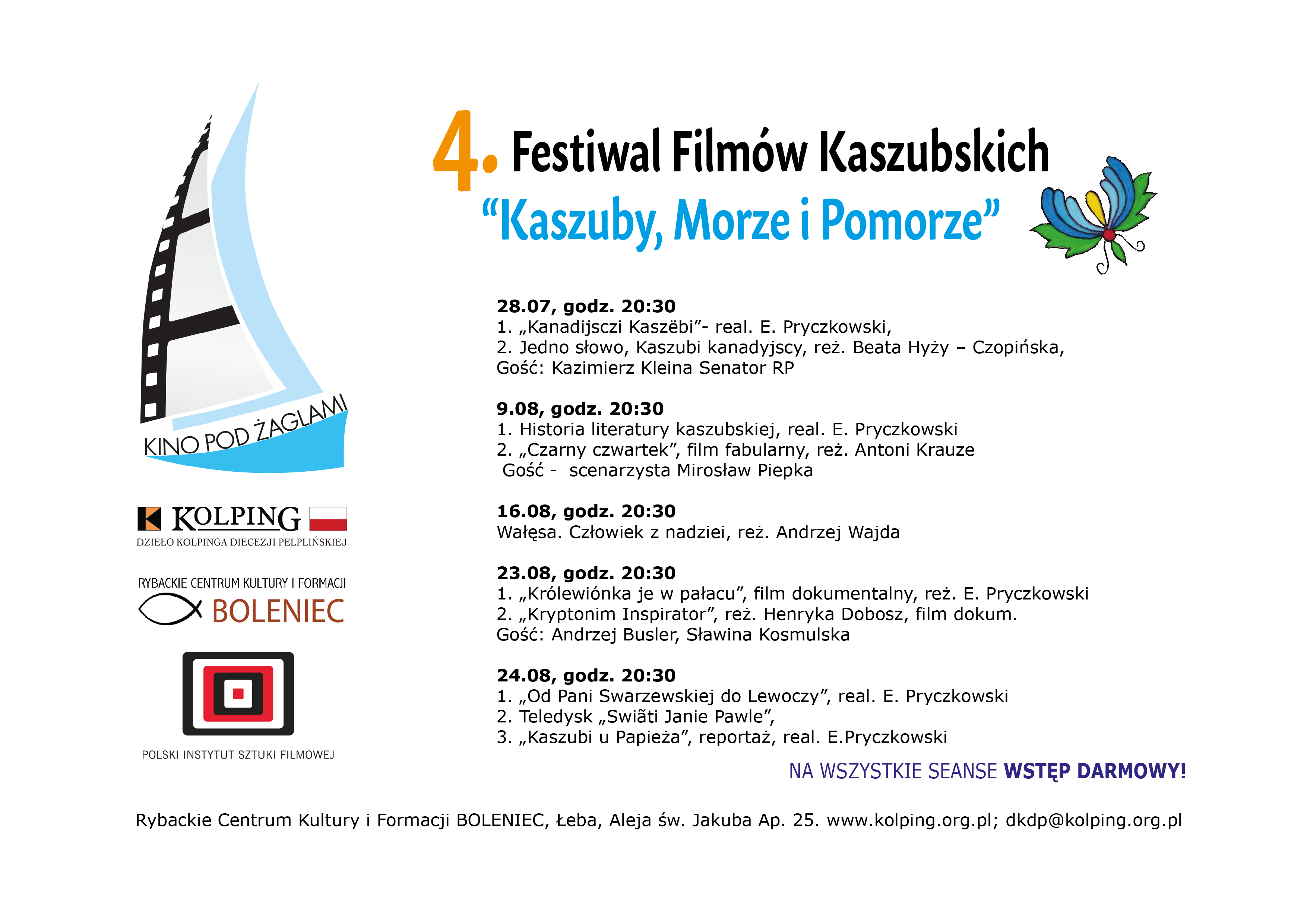 W poniedziałek 28. lipca rozpoczyna się w Łebie 4. Festiwal Filmów Kaszubskich "Kaszuby, Morze i Pomorze" przygotowany przez Rodzine Kolpinga z Łeby przy współpracy z Panem Eugeniuszem Pryczkowskich i Senatorem Kazimierzem Kleina.